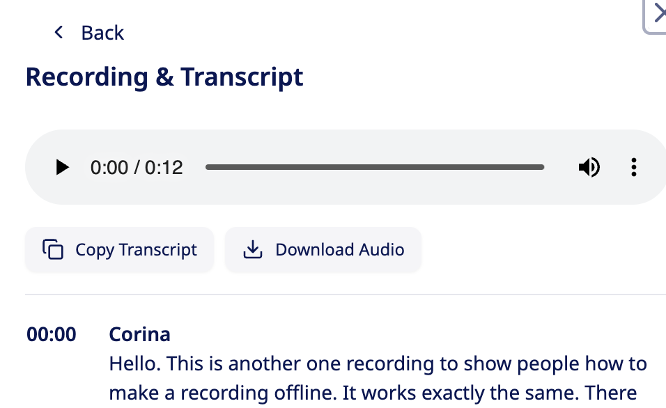 You also have the option to download the audio (if feature granted), and copy the transcript by clicking on either of the options as shown below.