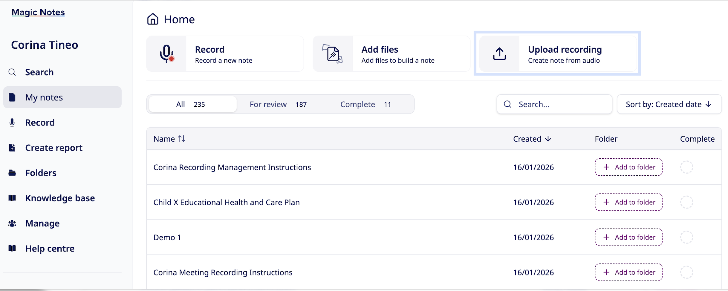 Magic Notes allows you to upload audio files which you have saved so that you can generate summaries, arrange them into templates and perfect them using our editing tools. This guide will walk you through how to upload these files from your mobile device or laptop.