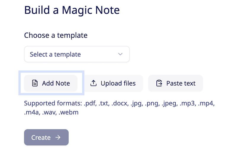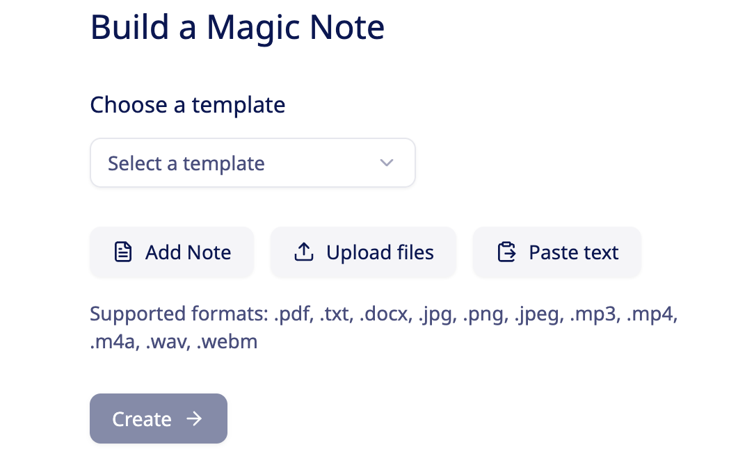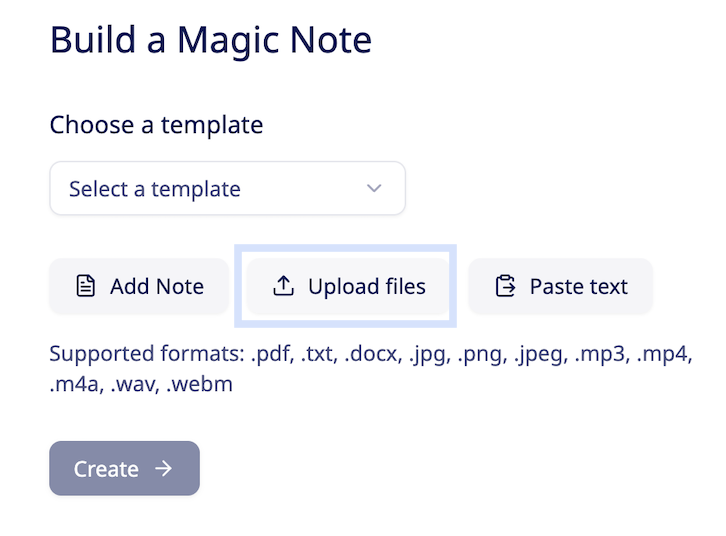 Please Note: Magic Reports accepts the following file formats: .pdf, .txt, .docx, .jpg, .png, .jpeg, .mp3, .mp4, .m4a, .wav, .webm